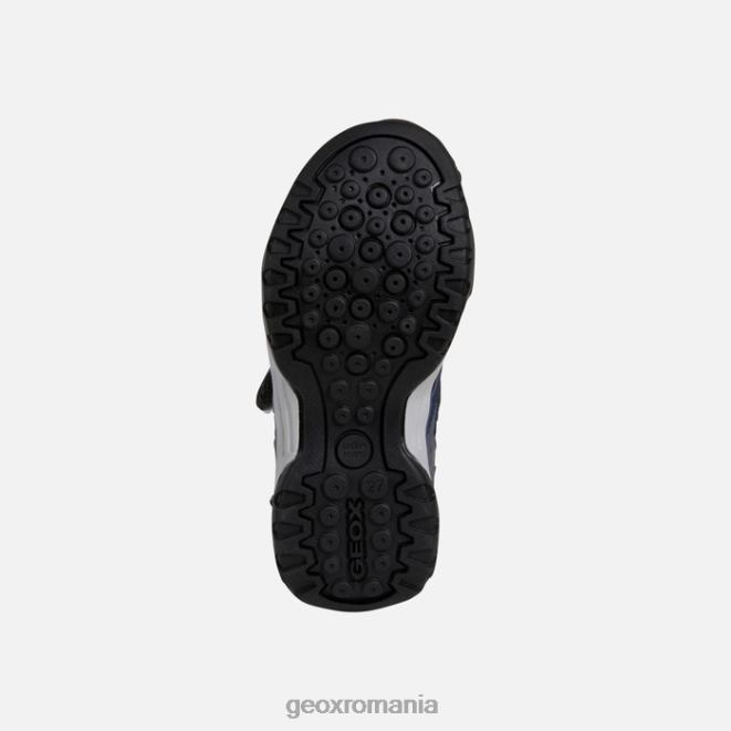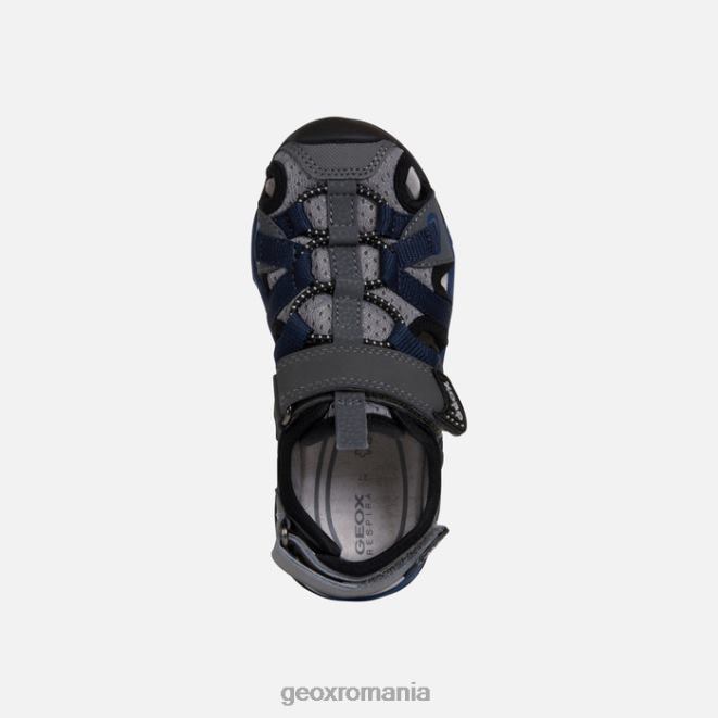 sandală pentru băiat în stil exterior, cu un design confortabil reglabil. o sandală respirabilă cu aspect activ, această versiune de Borealis este complet reglabilă cu o protecție pentru degete și vine cu o parte superioară din durabuck în relief și plasă respirabilă de culoare gri închis, cu detalii contrastante bleumarin. se va dovedi perfect pentru plimbări și activități în aer liber în general.
