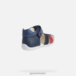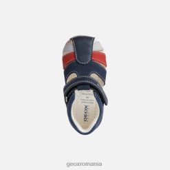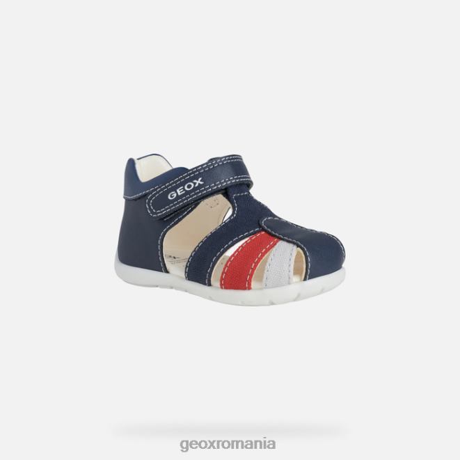 Sandală pentru primii pași pentru băiat, cu spatele închis, cu un design versatil și confortabil. Confecționată dintr-un material cu efect de piele cu detalii de pânză, elthan este o sandală respirabilă, ușor de asortat și plină de cool casual. această versiune-albastru-marin-închis-și-roșu are un design cu vârf închis și o închidere cu curele reglabile, ambele caracteristici esențiale care îi vor ține în siguranță pe micii aventurieri în timp ce aleargă și se joacă.