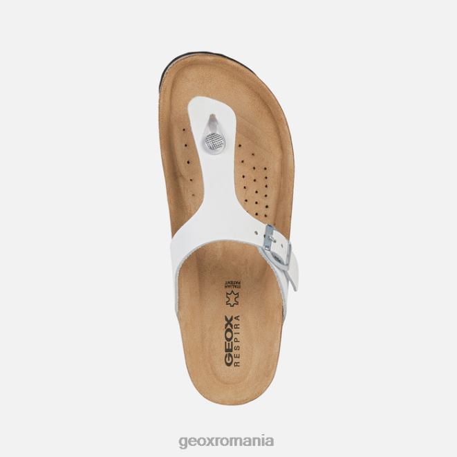 Sandală tanga respirabilă pentru femei, cu un design ergonomic. o icoană a verii prin excelență, brionia este o piesă de încălțăminte cu talpă ergonomică din plută concepută pentru a oferi o senzație de bine pe vremea cea mai caldă. partea superioară versatilă din piele albă emană o eleganță discretă și se va dovedi ușor de asortat.