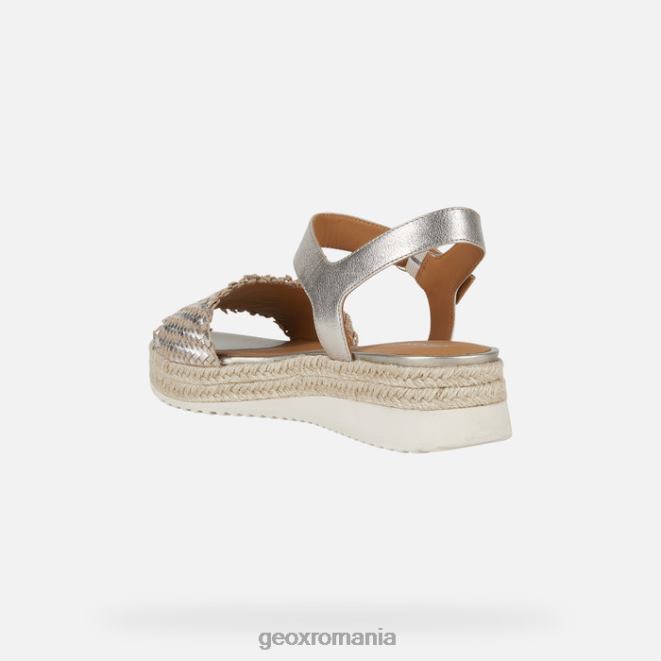 Sandale de damă ultra-confortabile cu un aspect casual. Sandalele eolie îmbunătățesc ținutele de zi cu zi cu talpă de iută și confort total. ultra-ușoare și confortabile, acestea sunt confecționate într-un amestec de piele cu efect de metal și piele țesută într-o paletă de șampanie luminoasă și versatilă.