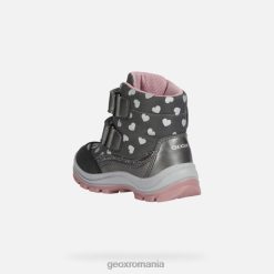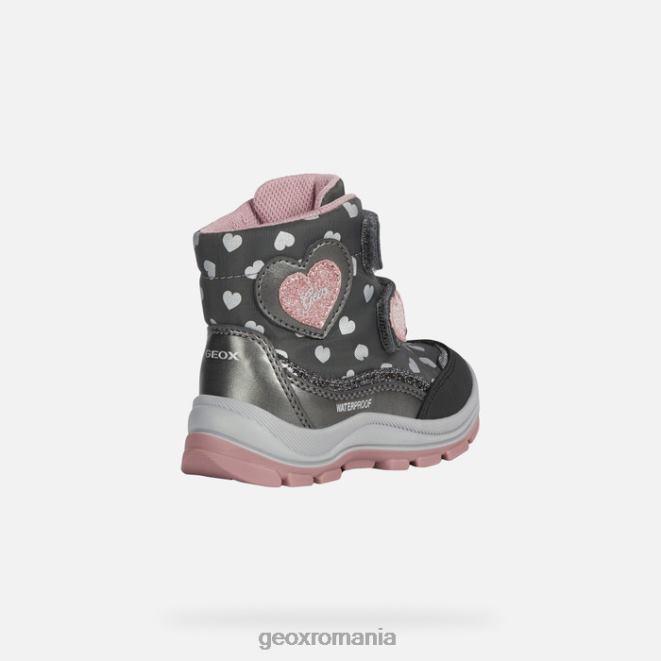 botine confortabile pentru fete, concepute pentru a proteja picioarele mici împotriva vremii aspre de iarnă și pentru a proteja umezeala și ploaia. Fabricat din nailon imprimat și dintr-un material cu efect de piele sidefat, de culoare gri închis, flanfil abx se mândrește cu o estetică în aer liber îmbunătățită cu accente drăguțe în formă de inimă în roz. o garanție excelentă de bunăstare și funcționalitate, protejează picioarele împotriva frigului și umezelii, oferind în același timp multă respirabilitate.