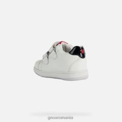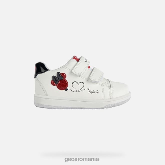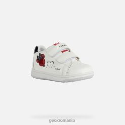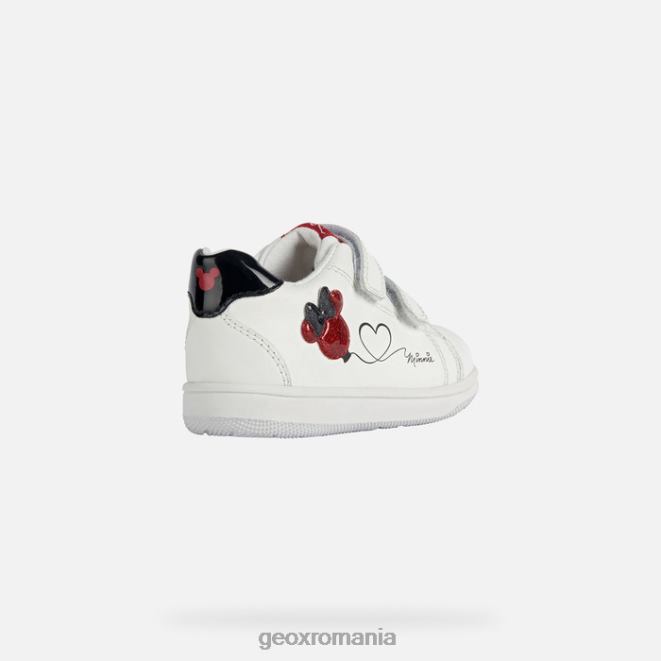 adidași casual respirabili pentru bebeluși pentru îmbrăcare confortabilă de zi cu zi, cu o notă de distracție. partea superioară albă prezintă detalii roșii și negru și a fost împodobită cu un balon strălucitor care are silueta mouse-ului minnie. Un produs al parteneriatului dintre Geox și Disney, New Flick este o piesă de încălțăminte sportivă realizată din nappa suplu și dintr-un material cu efect de piele lacuită, cu o intrare ușoară la picior.