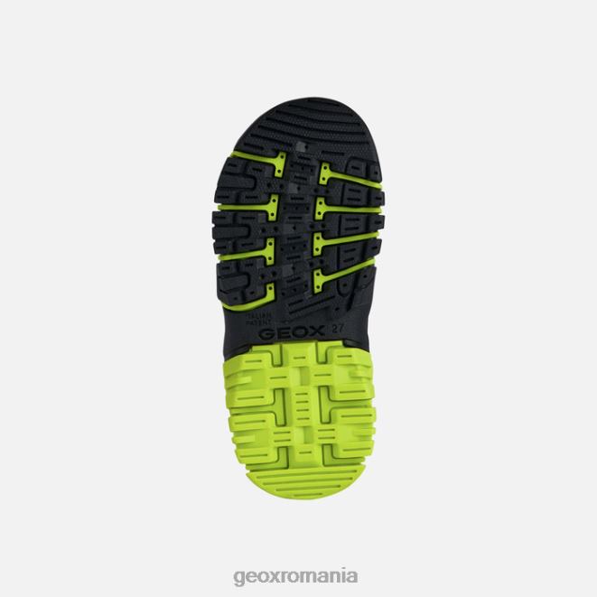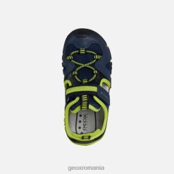 Sandală cu aspect sportiv pentru băieți, cu vârf închis întărit și atmosferă în aer liber. această versiune de dynomix albastru-marin și verde-lime are o parte superioară îndrăzneață, cu o intrare ușoară a piciorului și se sprijină pe o talpă exterioară flexibilă de amortizare. Fabricat din plasă și dintr-un material cu efect de piele ceară, este partenerul perfect pentru aventurile în aer liber.