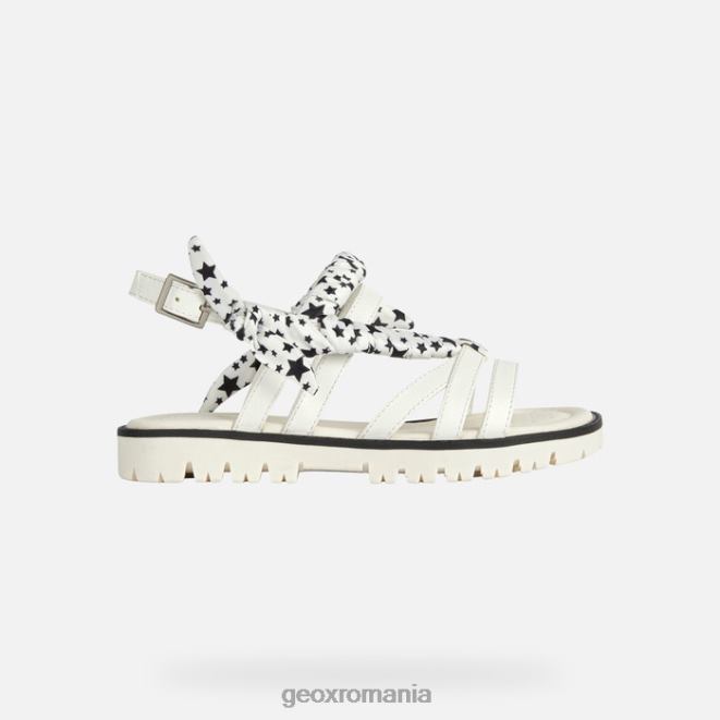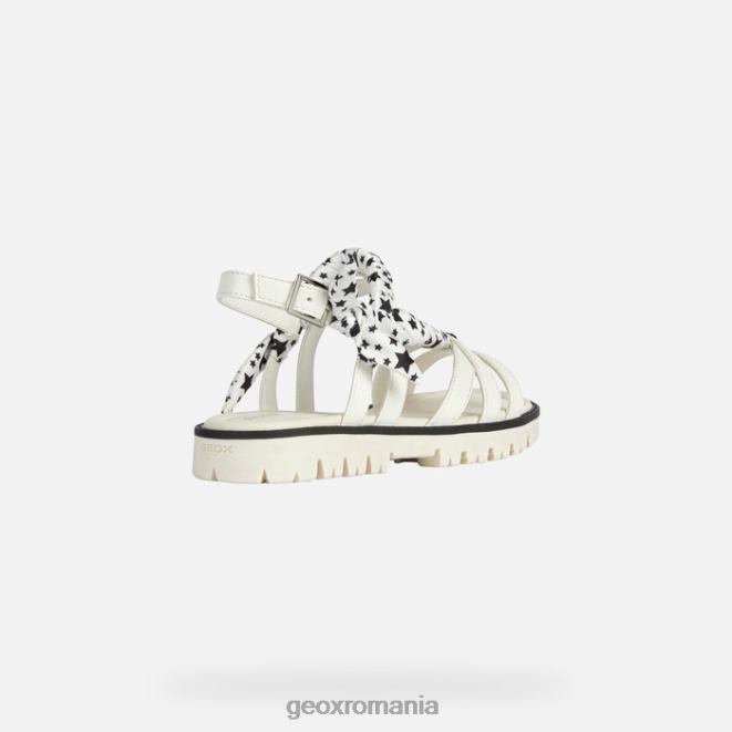 Sandală ușoară pentru fetiță, cu vârf deschis, cu o estetică contemporană și o senzație glam. starblush are o parte superioară albă originală, cu bretele încrucișate și a fost decorată cu stele negre imprimate pe detalii din țesătură. Atingând ultimele tendințe, fără a renunța la respirabilitate și confort, a fost realizat dintr-un material cu efect de piele.