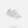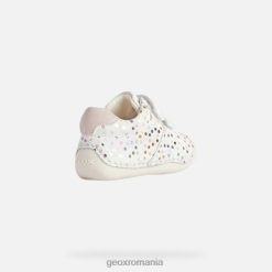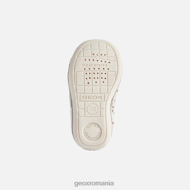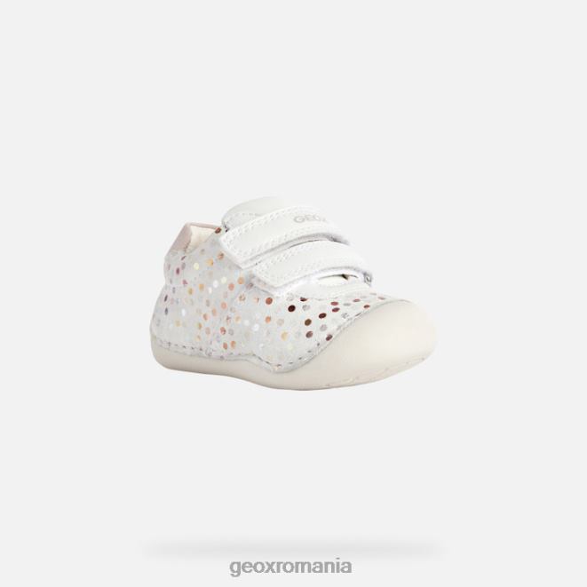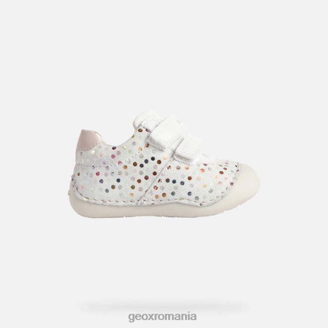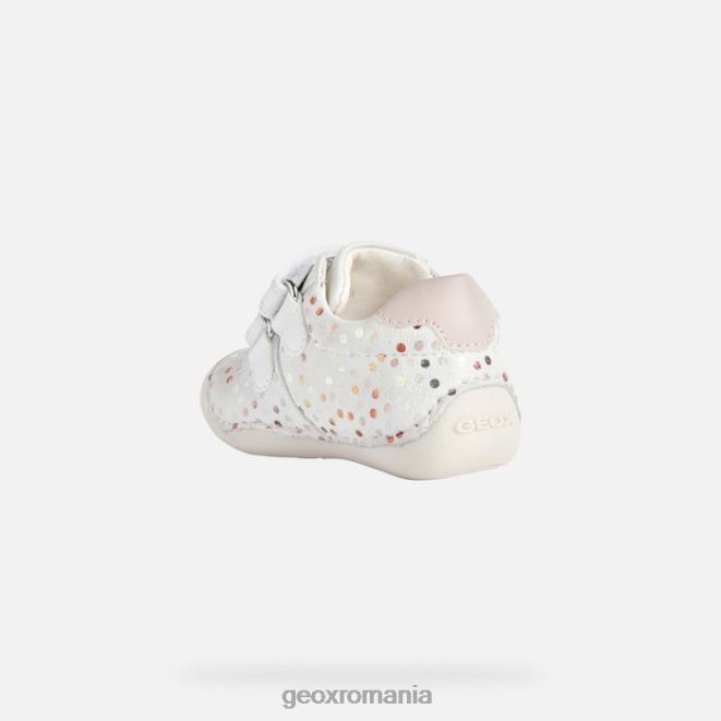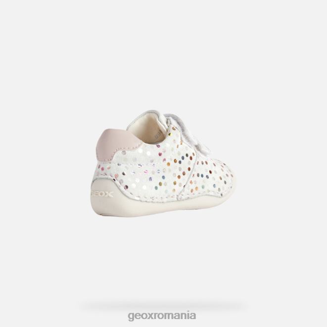pantof pentru bebeluși pentru micii crawler care oferă protecție și niveluri superlative de bunăstare. Fabricat din piele intoarsa imprimata si dintr-un material cu efect de piele intr-o paleta alb si roz pal, tutim este un pantof confortabil respirabil, cu o intrare rapida la picior. este alegerea perfectă pentru micii crawlers stilați, cu o parte superioară drăguță decorată cu puncte multicolore.
