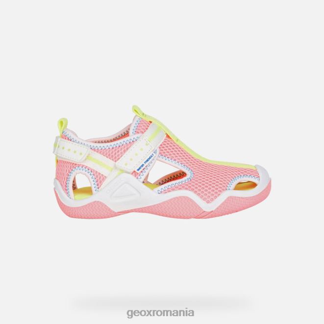 Sandale confortabile pentru fete, prietenoase cu apa, pentru activități în aer liber. cu o parte superioară realizată în întregime din plasă într-o variantă de culoare roz neon-fucsia-alb, wader este o sandală respirabilă care poate fi purtată în și în afara apei. apărătoarele de protecție de pe vârf și călcâi au fost concepute pentru a menține picioarele fetițelor în siguranță în timp ce se bucură de aventurile lor de zi cu zi.