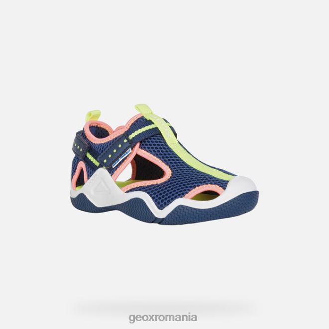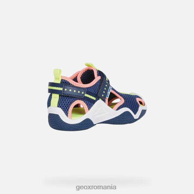 Sandală pentru fată în stil exterior, cu un design prietenos cu apa și respirabil. confectionata din plasa si un material cu efect de piele de culoare bleumarin cu detalii roz neon-fucsia, aceasta versiune de wader este piesa perfecta de incaltaminte pentru activitatile in aer liber ale copiilor. emanând un stil lejer, are apărătoare de protecție pe degete și călcâi și poate fi purtat în și în afara apei.